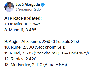 Esta vitória coloca Auger-Aliassime à frente de Jack Draper (que não joga mais este ano) na corrida para as ATP Finals e a apenas 490 pontos de Musetti.