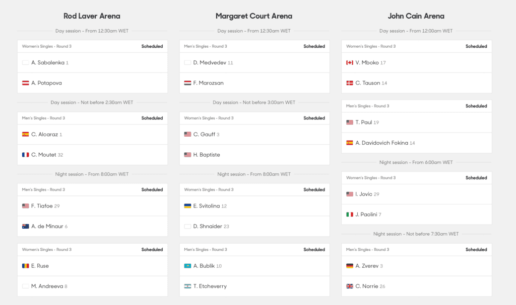A terceira ronda de singulares do Australian Open arranca esta sexta-feira em Melbourne Park e abre logo com Nuno Borges, que atua à meia-noite de Portugal Continental diante de Learner Tien na KIA Arena. Francisco Cabral entra em court duas vezes: primeiro na segunda ronda de pares masculinos e depois na primeira de pares mistos.