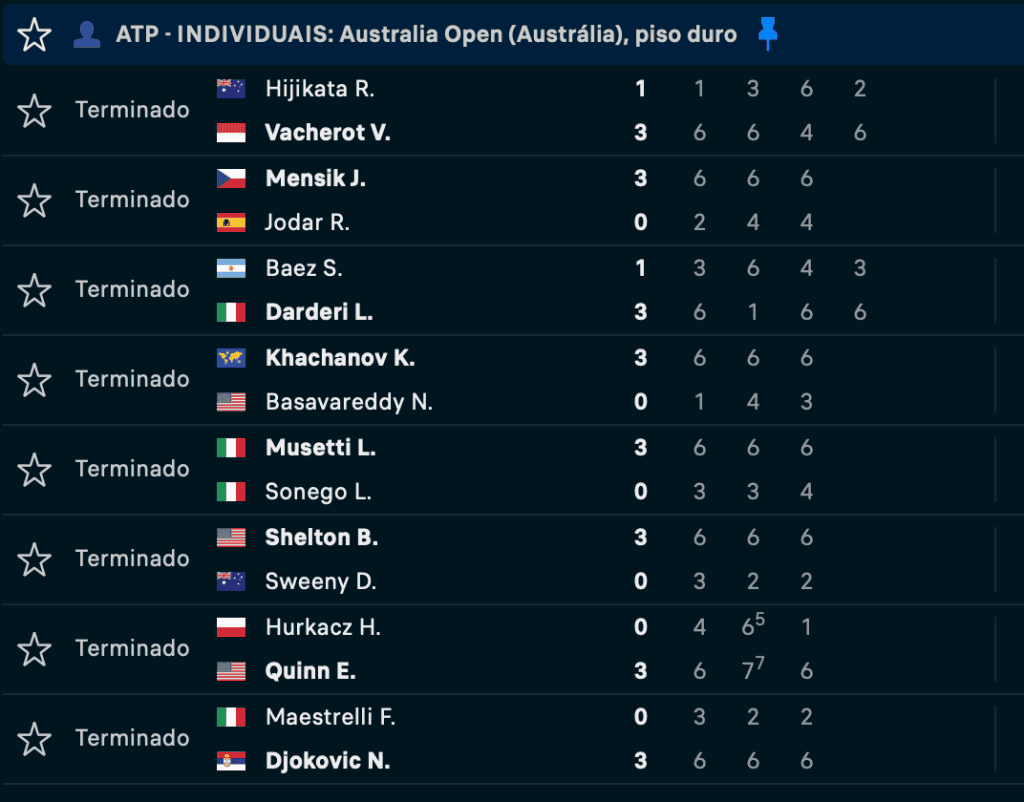 Lorenzo Musetti, número cinco do Mundo, e Ben Shelton, oitavo ATP, também venceram rápida e facilmente. O italiano bateu o compatriota e homónimo Lorenzo Sonego por 6-3, 6-3 e 6-4, ao passo que Shelton atropelou o qualifier local Dane Sweeny por 6-3, 6-2 e 6-2.