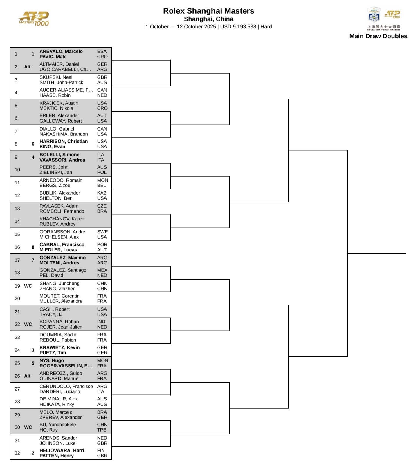 De resto, nota para a presença de vários nomes de singulares como Alexander Zverev (joga com Marcelo Melo) ou Alexander Bublik com Ben Shelton.