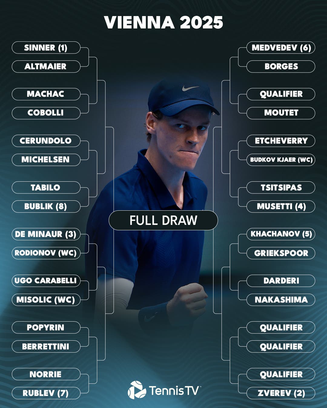 Foi conhecido este sábado o quadro do ATP 500 de Viena, que para além de contar com metade do atual top 10 mundial vai ter uma primeira ronda de grande interesse para o ténis nacional e que opõe o russo Daniil Medvedev (14.º, ex-líder mundial e vencedor do torneio em 2022) ao português Nuno Borges. Será o quarto encontro entre os dois e Medvedev venceu os três anteriores.