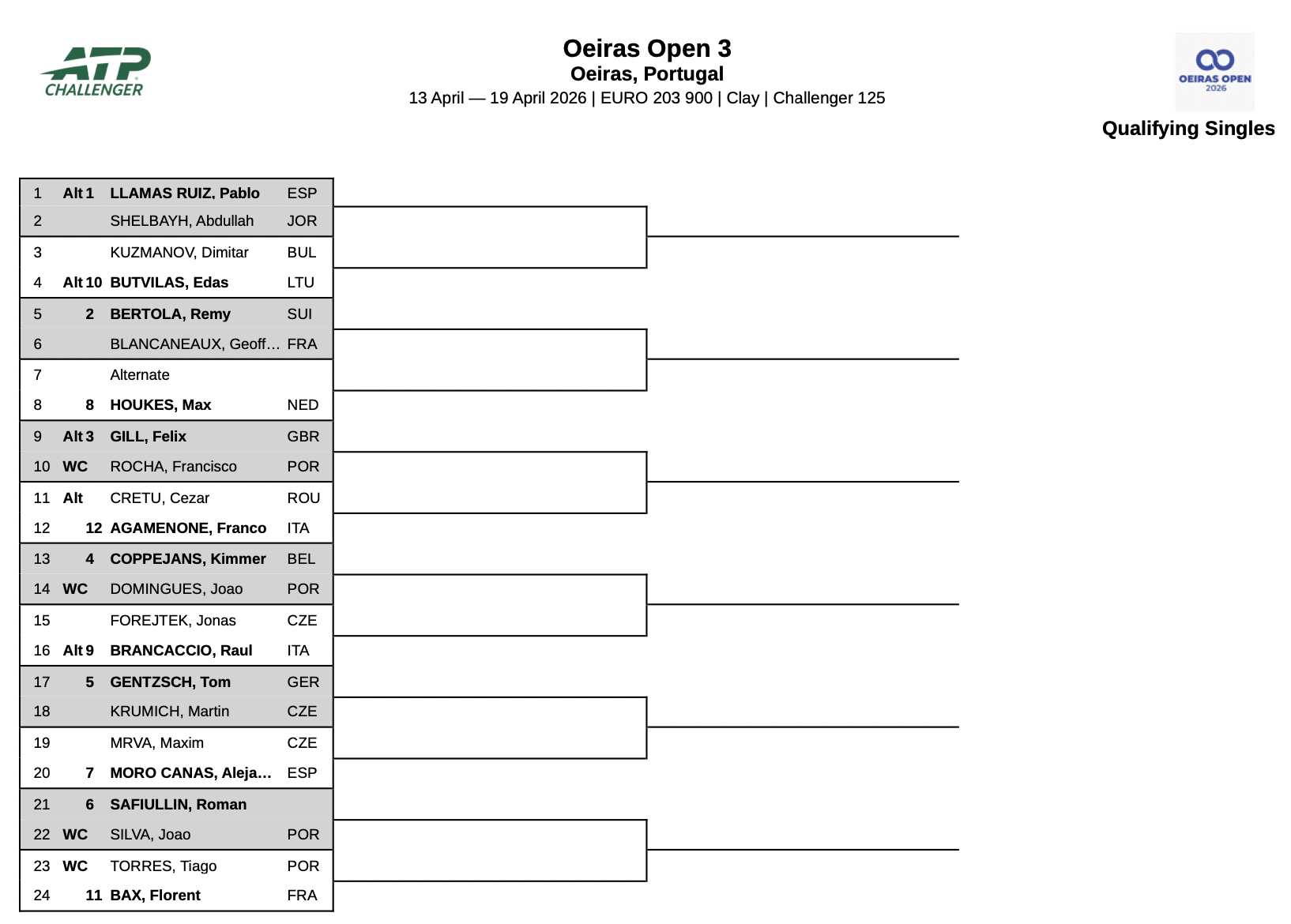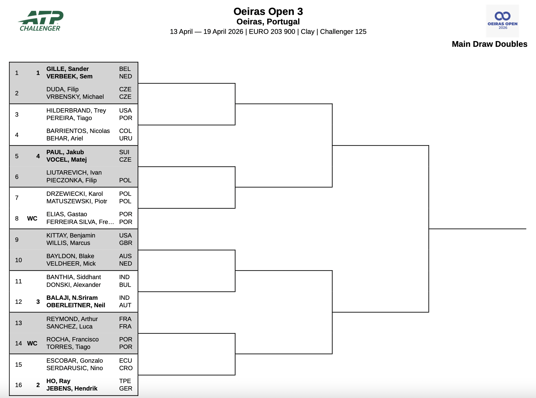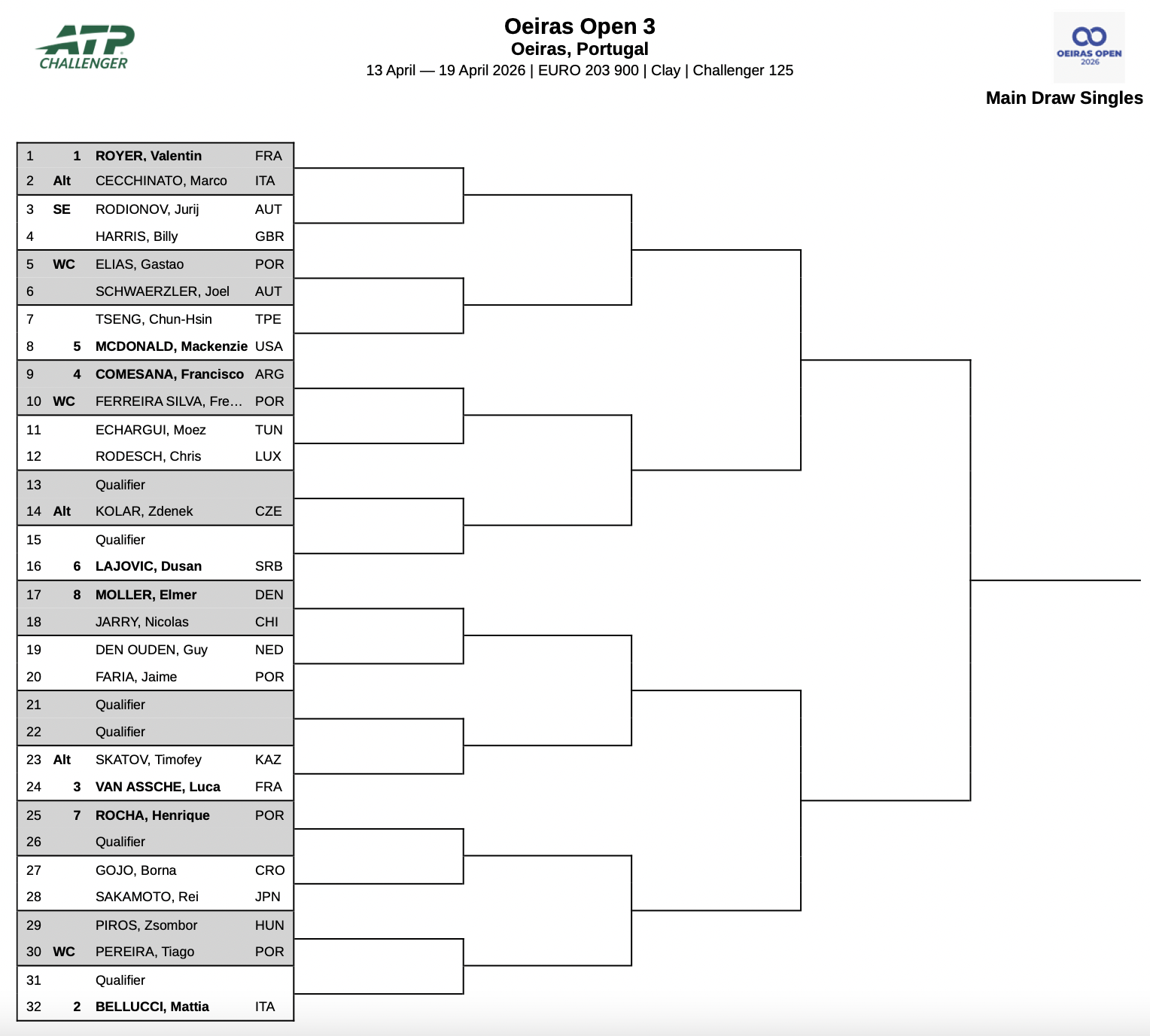 Eis os quadros do Oeiras Open 3 com muitos portugueses em ação