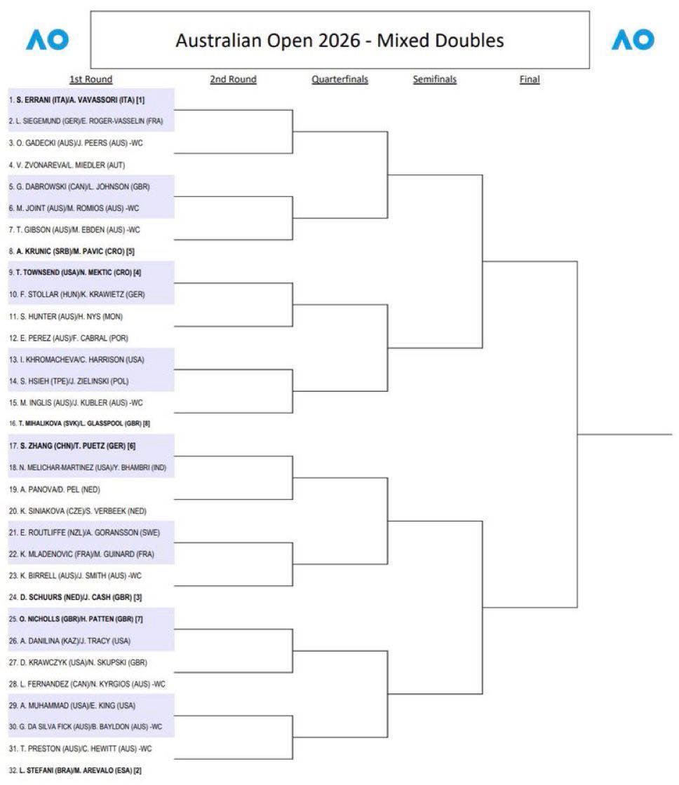 O português vai fazer parceria com a australiana Ellen Perez, 21.ª do ranking feminino de pares, sendo que esta dupla luso-australiana arranca a sua participação a medir forças com a australiana Storm Hunter e o monegasco Hugo Nys. Diga-se que os principais cabeças-de-série são os italianos Sara Errani Andrea Vavassori, seguidos de Luisa Stefani Marcelo Arevalo.