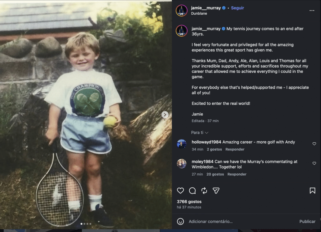 Na publicação, Jamie Murray afirma que“a sua jornada no mundo do ténis chega ao fim passados 36 anos”. Deixou ainda palavras de agradecimento à família, amigos e staff, dizendo que “sem os seus sacrifícios nada disto teria sido possível.