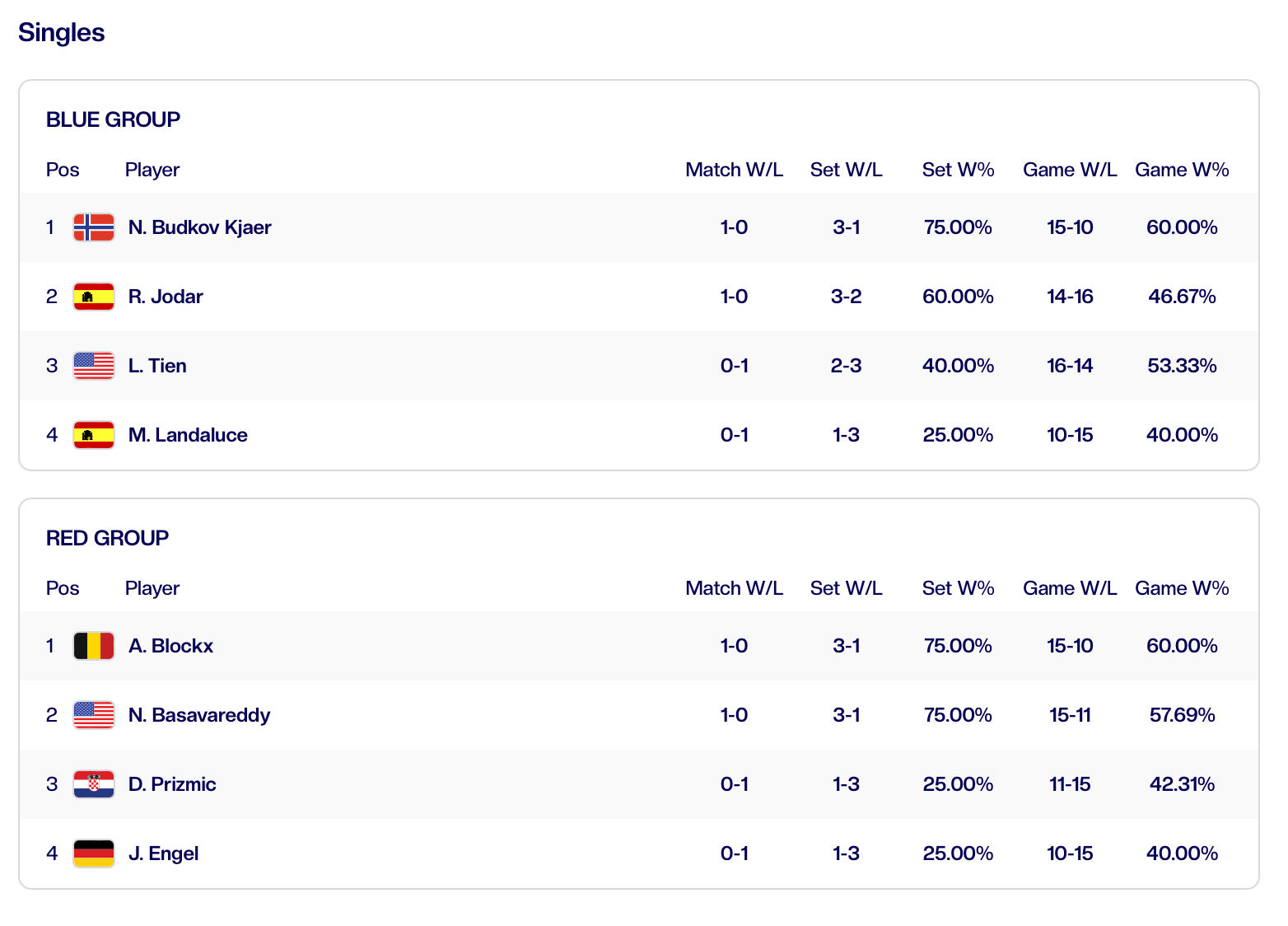 No Grupo Vermelho, Nishesh Basavareddy (167.º) entrou a ganhar frente ao croata Dino Prizmic (128.º), impondo-se por 4-2, 4-3(7), 3-4(3) e 4-2. Já o belga Alexander Blockx (116.º) mostrou solidez ao bater o alemão Justin Engel (187.º)por 3-4(7), 4-2, 4-2 e 4-2, assumindo a liderança provisória do grupo.