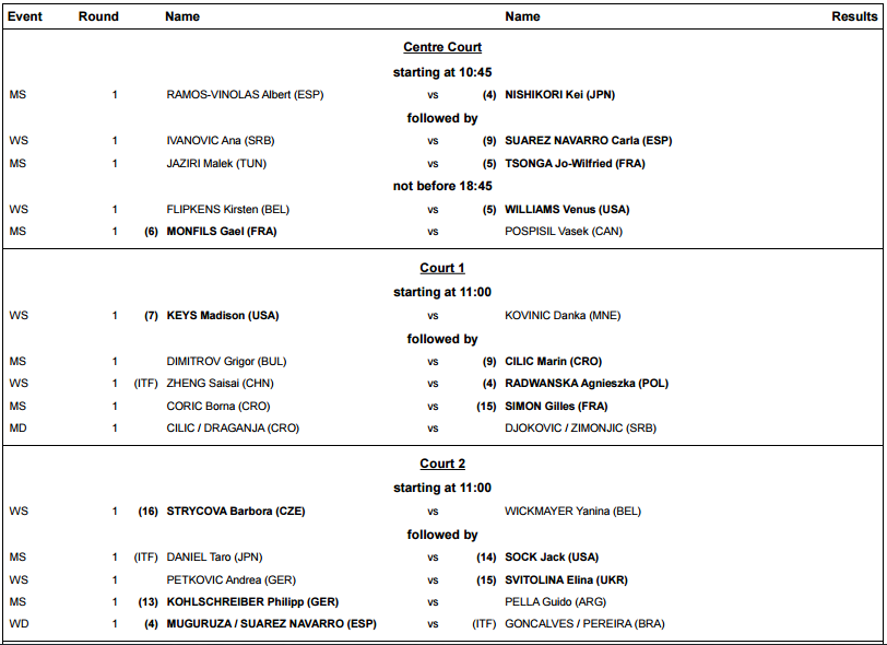 Cabe a Kei Nishikori abrir as hostilidades do Court Central diante do espanhol Albert Ramos, seguido por um muito aguardado duelo entre Ana Ivanovic e Carla Suarez Navarro. Venus Williams, medalhada de ouro em singulares nos Jogos Olímpicos de 2000 (Sydney), vai medir forças com a belga Kirsten Flipkens.