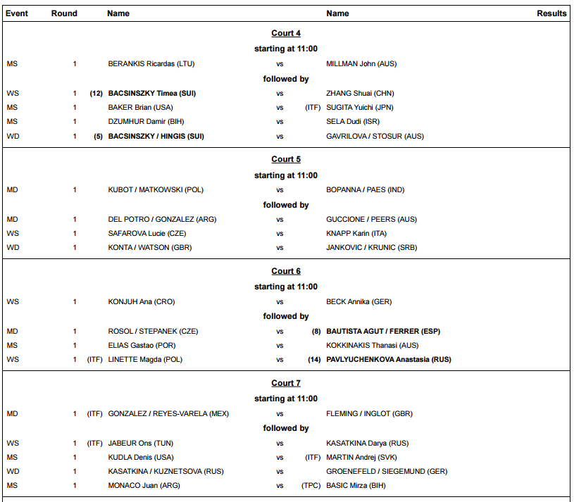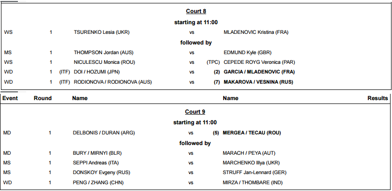 O Court 1 vai contar com estrelas como Marin Cilic, Grigor Dimitrov, Agniezska Radwanska, Borna Coric e o número um mundial, Novak Djokovic, que vai disputar a primeira ronda de pares com Nenda Zimonjic frente à dupla croata Marin Cilic e Marin Draganja.