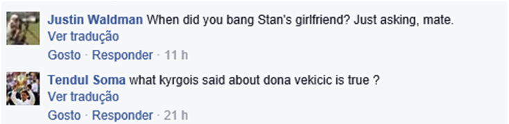 - Quando é que c*m*ste a namorada do Stan? Só estou a perguntar, meu. / O que o Kyrgios disse da Donna é verdade?
