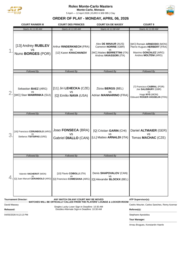 O ATP Masters 1000 de Monte-Carlo prossegue esta segunda-feira no Principado do Mónaco com os dois portugueses em ação logo pela manhã. Nuno Borges abre a ação do court central diante de Andrey Rublev, ex-campeão da prova, logo às 10h da manhã, ao passo que Francisco Cabral estreia a nova parceria com o britânico Joe Salisbury, ex-número um do Mundo, pelas 11h30. Como há uma forte possibilidade de os encontros coincidirem, a SPORT TV abeirará nesse período um canal para acompanhar Cabral, mantendo-se a emissão do canal ‘principal’ com os encontros de singulares do Court Central.