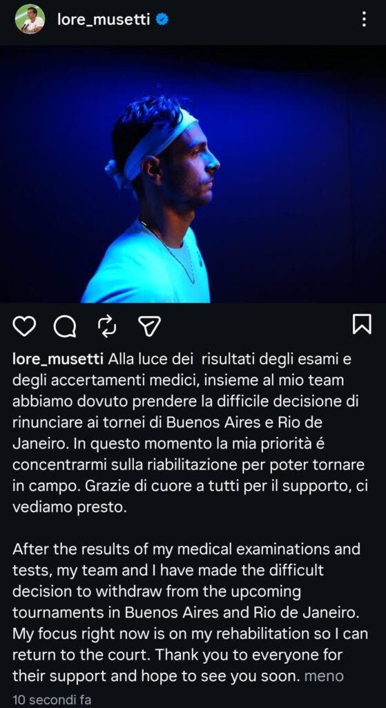 Lorenzo Musetti vai estar ausente dos courts durante o mês de fevereiro. O italiano saiu lesionado do Open da Austrália 2026, onde foi obrigado a abandonar nos quartos de final frente a Novak Djokovic, e confirmou agora, através das redes sociais, que também não irá competir nos torneios de Buenos Aires e do Rio de Janeiro.