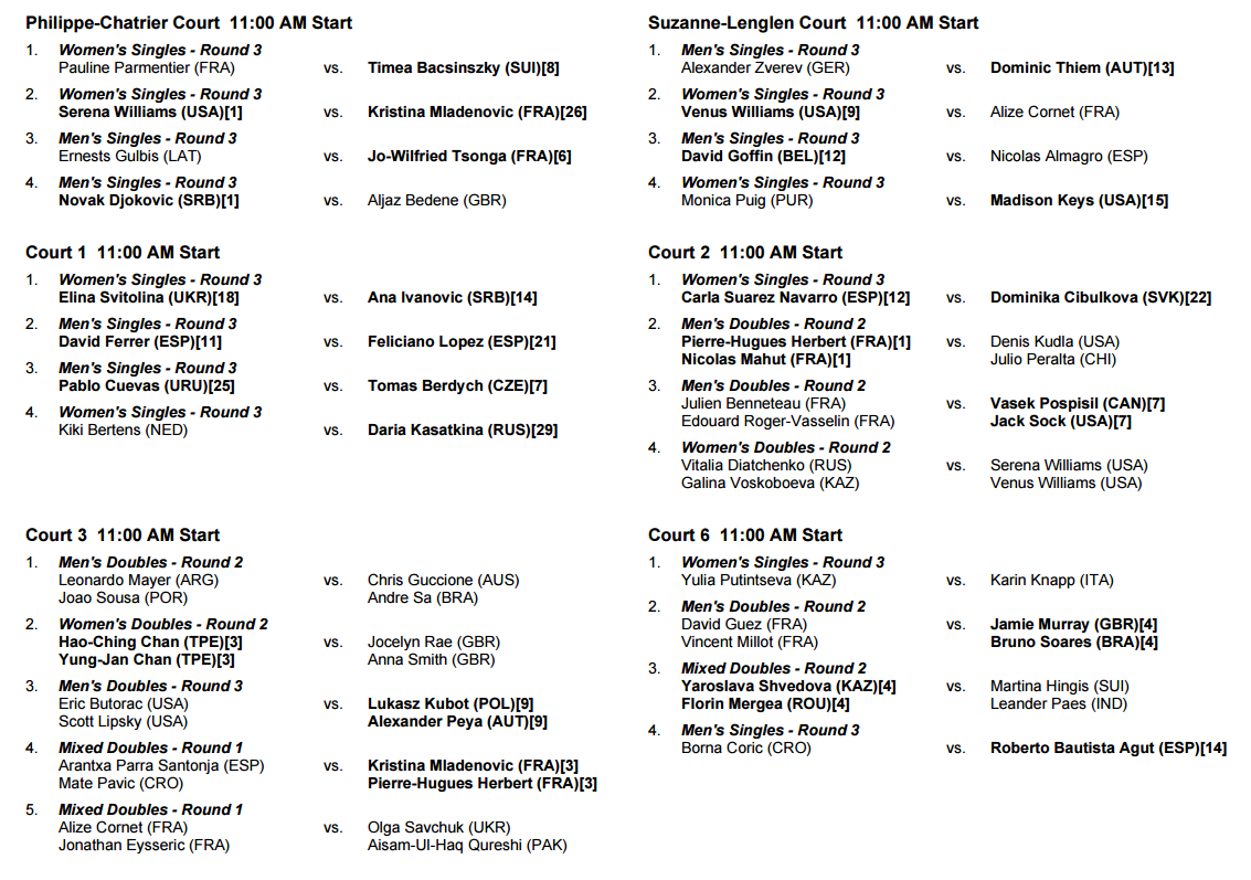 Os sérvios Novak Djokovic e Ana Ivanovic vão regressar aos courts, respetivamente ao Philippe-Chatrier e ao Court 1, para lutar pelo acesso aos oitavos-de-final, enquanto os jovens Dominic Thiem e Alexander Zverev vão reencontrar-se no court Suzanne Lenglen, exatamente uma semana depois da final em Nice.