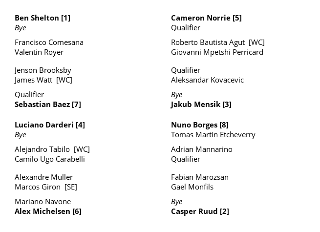 Foram conhecidos este sábado ao início da madrugada dos quadros de singulares e pares do ATP 250 de Auckland, que conta com a estreia em 2026 de Ben Shelton. Nuno Borges, semifinalista em 2025, vai defrontar pela primeira vez na carreira o argentino Tomas Etcheverry, num encontro entre dois tenistas que já foram top 30 ATP, ao passo que Casper Ruud poderá estrear-se contra Gael Monfils, campeão em título.