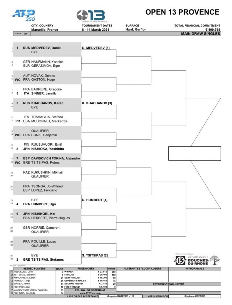 A semana que se segue vai contar com três torneios ATP, um dos quais é o ATP 250 de Marselha, cujo quadro principal já é conhecido.