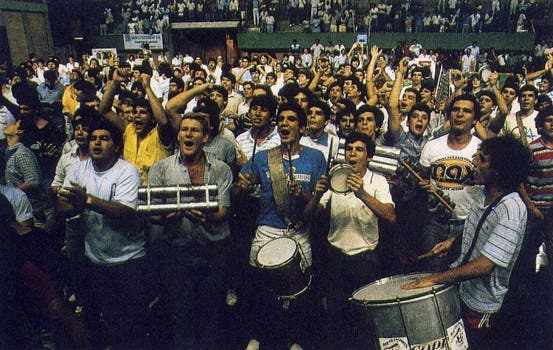 Esta é uma daquelas histórias que quanto mais velha fica mais fascinante se torna. Pois bem, corria o ano de 1985 quando a equipa francesa rumou a Assunção para o confronto da Taça Davis com o Paraguai, ciente de que o confronto não seria um mar de rosas, mas, ainda assim, longe de imaginar o que estava para vir. Henri Leconte e Yannick Noah depararam-se com um court montado num ginásio, onde o público se acomodava apenas a alguns passos das linhas laterais, logo atrás dos juízes de linha. Cerca de 3500 pessoas confinadas a um espaço limitado, com o público da casa munido de instrumentos musicais, que não se coibia de usar mesmo durante a discussão dos pontos. “Filho da p***” e “macaco” foram alguns dos “elogios” que Noah ouviu enquanto ia pisando um court feito com…. ripas de madeira. Os loucos anos 80.