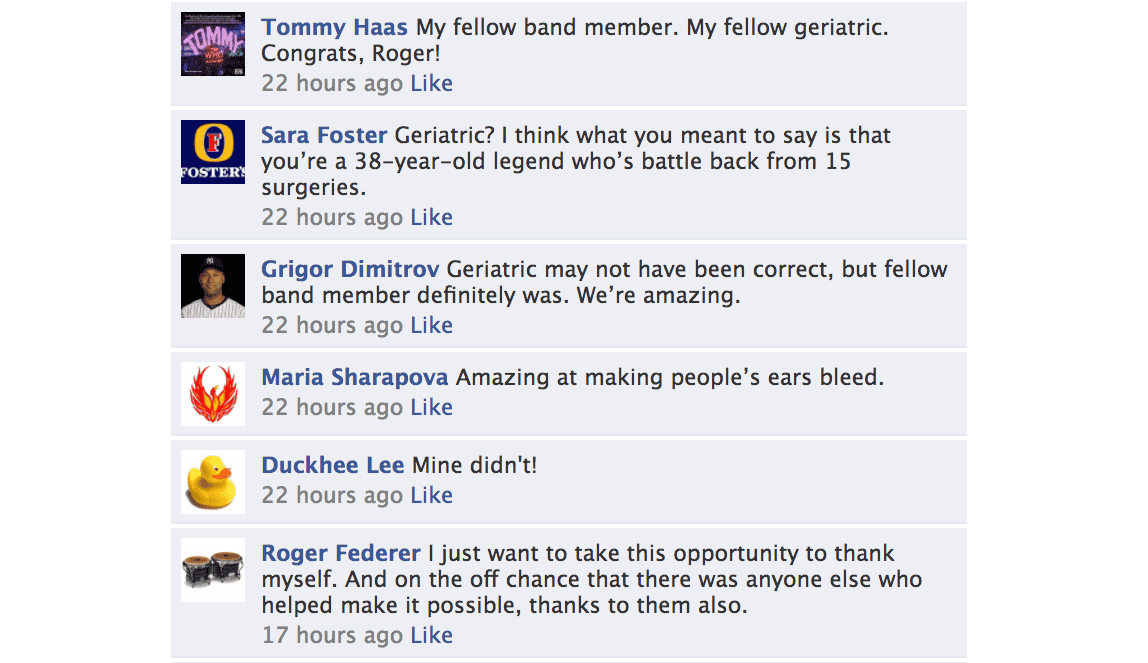 Imagine que nomes como Roger Federer, Rafael Nadal, Novak Djokovic, Ryan Harrisson, Maria Sharapova ou Melanie Oudin tinham um perfil de Facebook, e que comentavam as publicações uns dos outros. Como seria? Essa brilhante ideia foi desenvolvida pela equipa do “The Grandstand“ e tem agora um novo episódio: a conquista do 18.º Grand Slam por parte de Federer.
