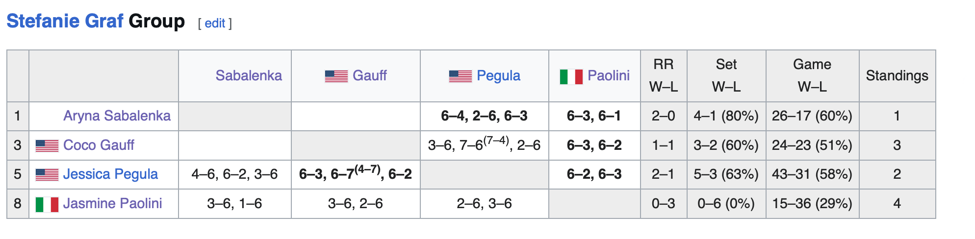 Assim, Aryna Sabalenka e Coco Gauff vão discutir de seguida a última vaga nas meias-finais. A bielorrussa ganha o grupo se derrotar Gauff, mas um set deve chegar-lhe para se apurar. Gauff precisa de ganhar em dois sets quase garantidamente. Uma vitória em três só serve se os dois sets que ganhar forem muito desequilibrados.