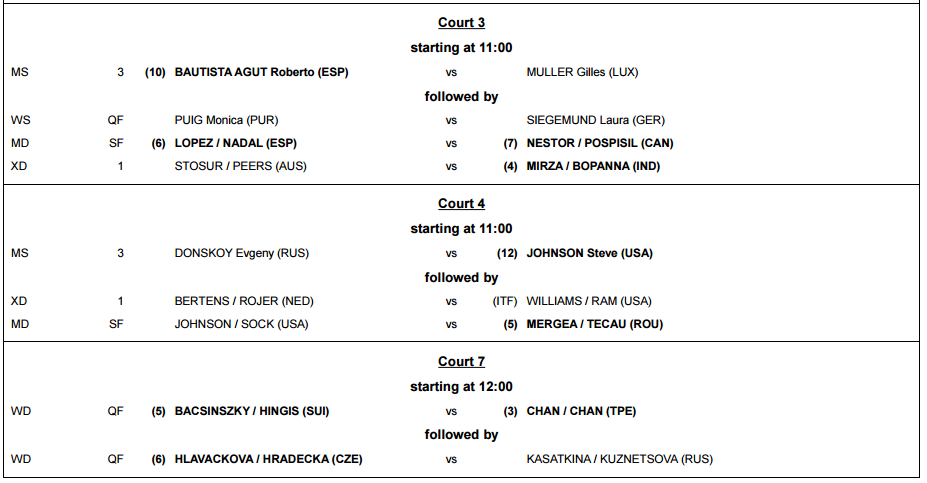 Tanto o Court Central como os Courts 1 e 2 estão reservados para as vertentes de singulares masculino e feminino. No Central, Rafael Nadal – que terá jornada tripla – e Andy Murray vão lutar pelo acesso aos quartos-de-final da prova, ao passo que Angelique Kerber tentará tornar-se numa das semifinalistas apuradas no Rio de Janeiro. Juan Martin del Potro vai inaugurar o Court 2.