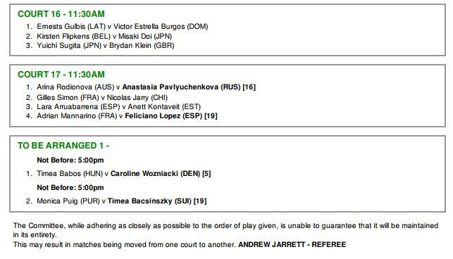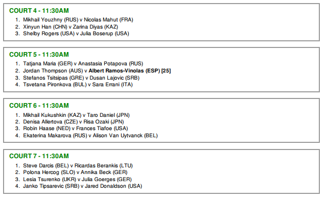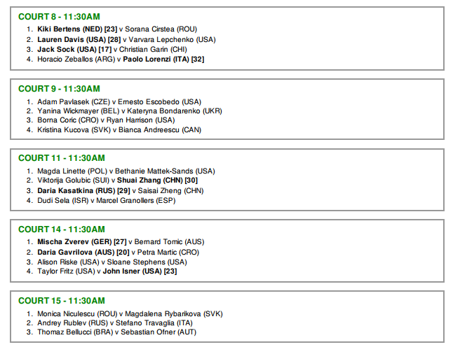 A jogadora alemã vai medir forças com Irina Falconi antes de Novak Djokovic e Roger Federer, dois antigos campeões da prova, lutarem também pelo acesso à segunda ronda. Milos Raonic, Karolina Pliskova e Dominic Thiem irão estrear-se este ano no Court 1 e Juan Martin del Potro vai arrancar o seu embate diante do jovem Thanasi Kokkinakis no Court 2.