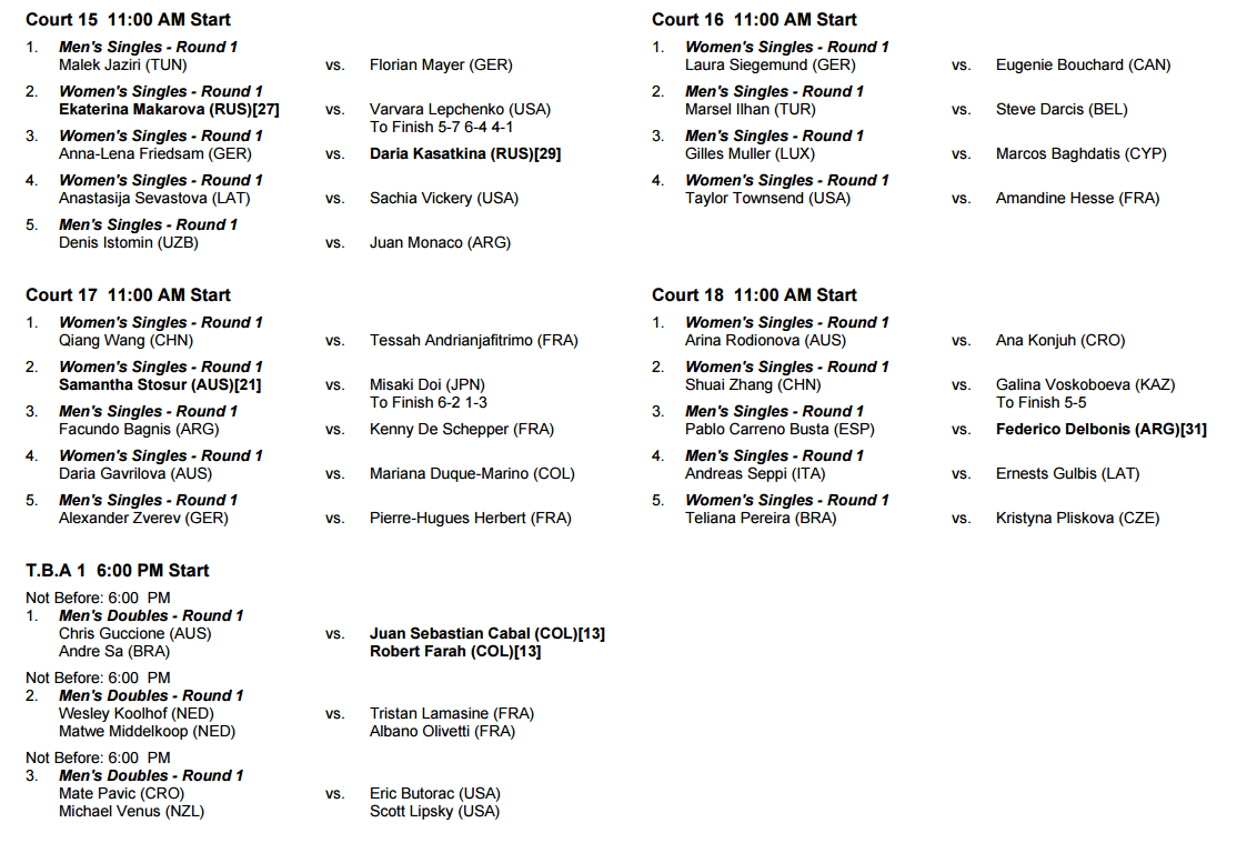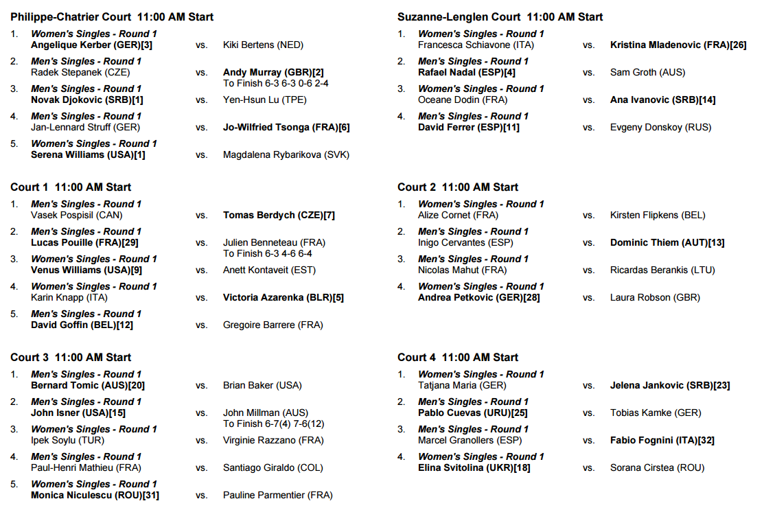 Já no Court Suzanne Lenglen, Rafael Nadal, nove vezes campeão de Roland Garros, vai entrar em court pela primeira vez para medir forças com Sam Groth. Os outros courts vão contar com a presença de estrelas como Tomas Berdych e Victoria Azarenka (Court 1) ou Dominic Thiem e Andrea Petkovic (Court 2). João Sousa segue a acção no Court 5 depois de dois encontros femininos.