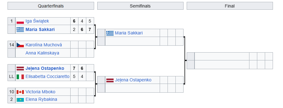 Nos quartos-de-final, Sakkari derrotou nada mais, nada menos do que a polaca Iga Swiatek, número dois do Mundo e três vezes campeã deste torneio, por 2-6, 6-4 e 7-5, em mais de duas horas de batalha. Sakkari tinha perdido os últimos quatro encontros diante da polaca, mas desta feita a história foi diferente.