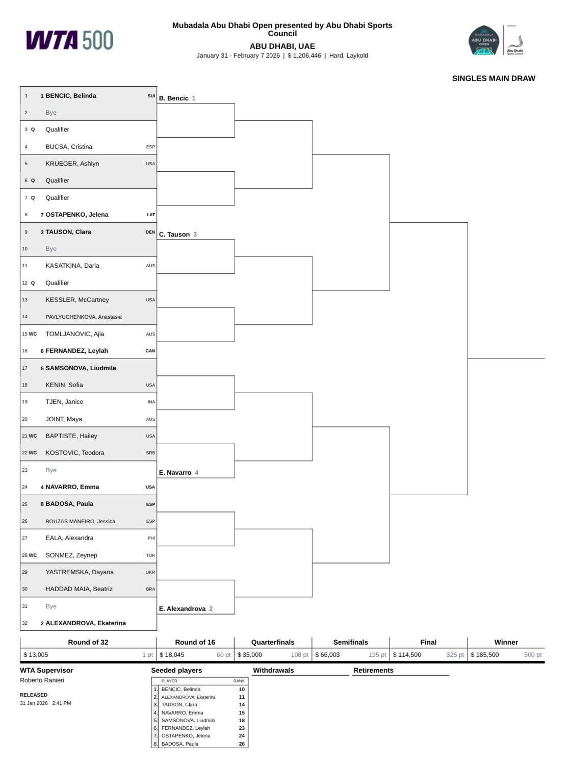 A nível feminino, Abu Dhabi recebe uma prova WTA 500, que tem Belinda Bencic, Ekaterina Alexandrova, Clara Tauson, Emma Navarro ou Paula Badosa.
