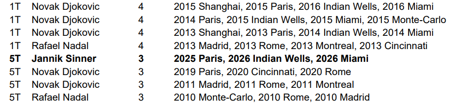 Mas este domínio de um jogador em provas desta categoria não é nada comum, tanto que o italiano tornou-se apenas no terceiro homem da história a conquistar quatro Masters 1000 consecutivos.