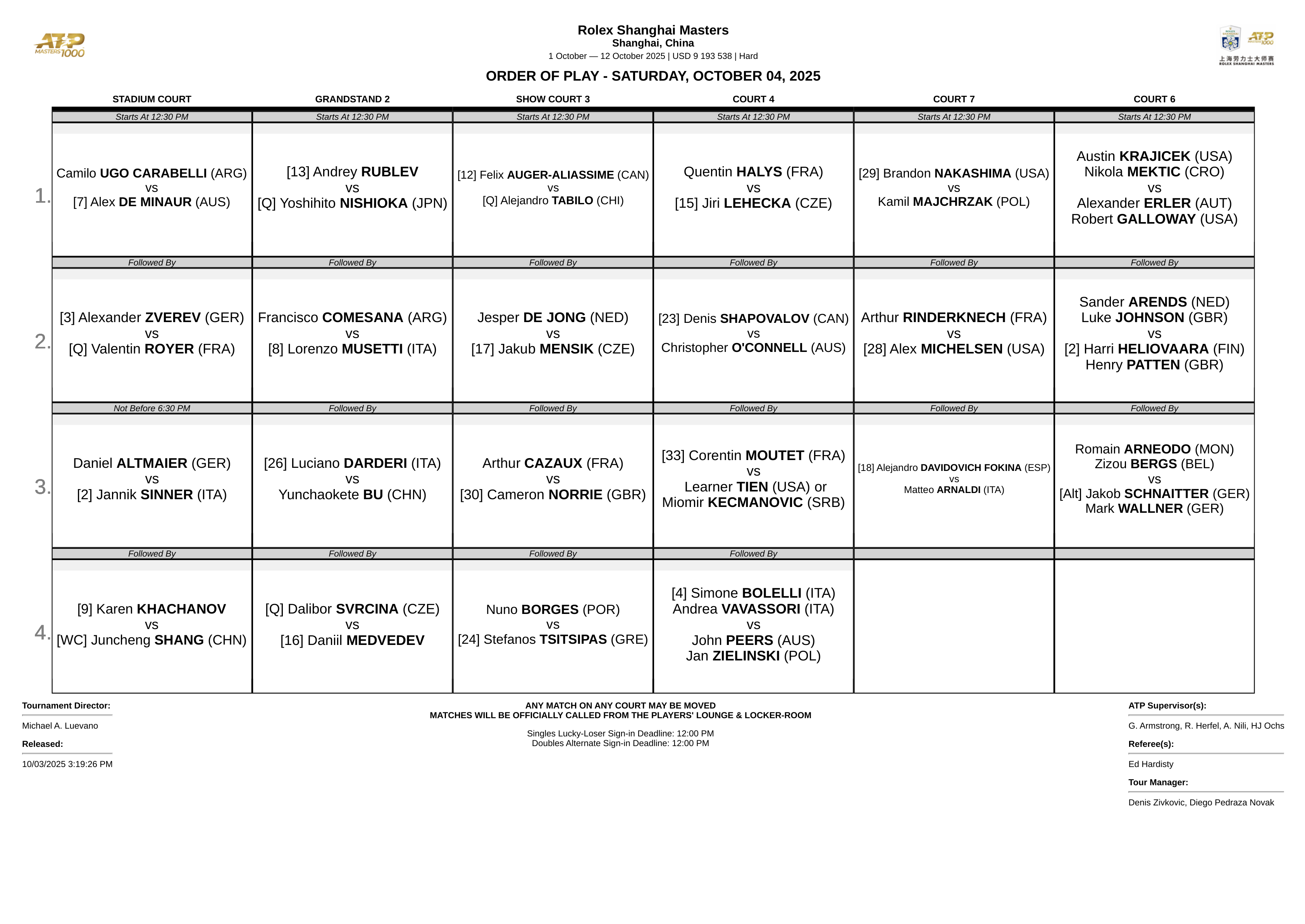 Já é conhecida a ordem de encontros para a jornada de sábado do ATP Masters 1000 de Xangai, que assiste à conclusão da segunda ronda de singulares. Entram em court Jannik Sinner, Alexander Zverev, Lorenzo Musetti e, claro, Nuno Borges, que tem encontro marcado com Stefanos Tsitsipas.