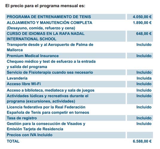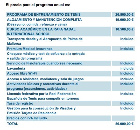 Pois bem, a qualidade paga-se cara e um ano a usufruir do programa de treino e de formação académica (os estudos não são esquecidos) na La Rafa Nadal Academy by Movistar vai custar qualquer coisa como 56 mil euros por ano – de setembro a junho.